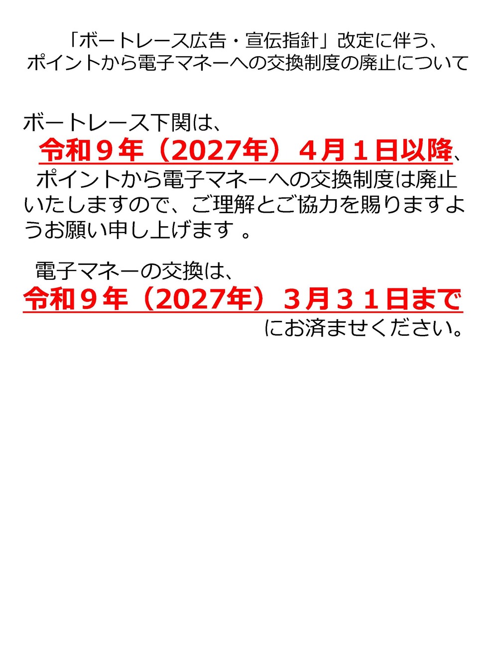 ボートレース下関は、令和9年(2027年)4月1日以降、「e~ほっ!カード」のポイントから電子マネーへの交換制度は廃止いたしますので、ご理解とご協力を賜りますようお願い申し上げます。